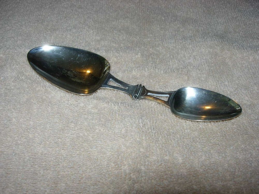 Sterling silver folding spoon by R. Blackinton (8290), tablespoon and teaspoon with hinged center.